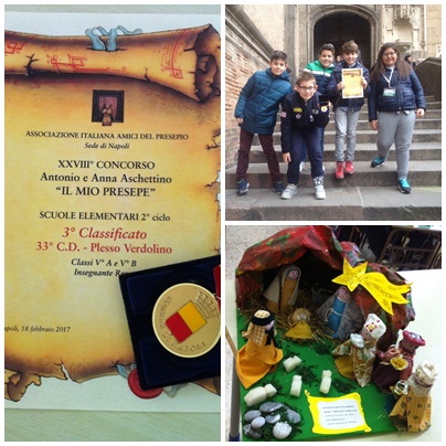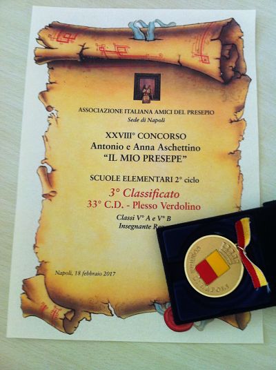 Dopo un lungo e laborioso percorso didattico iniziato nel mese di ottobre che ha avuto come protagonista principale "Il presepe napoletano del '700" gli alunni delle classi VA e VB della scuola primaria del plesso Verdolino hanno visto coronato i loro sforzi con la premiazione del presepe realizzato con le loro maestre Cristina Rega, Maria Impresa, Maria Lucci e Lina Pucillo. Infatti hanno partecipato al XXVIII° concorso "Il mio presepe" di Antonio e Anna Aschettino patrocinato dall'assessorato scuola e istruzione comune di Napoli ottenendo il 3° posto, così sabato 18 febbraio presso la sala dei Baroni del Maschio Angioino sono stati premiati dall'assessore alla cultura e all'istruzione Annamaria Palmieri.